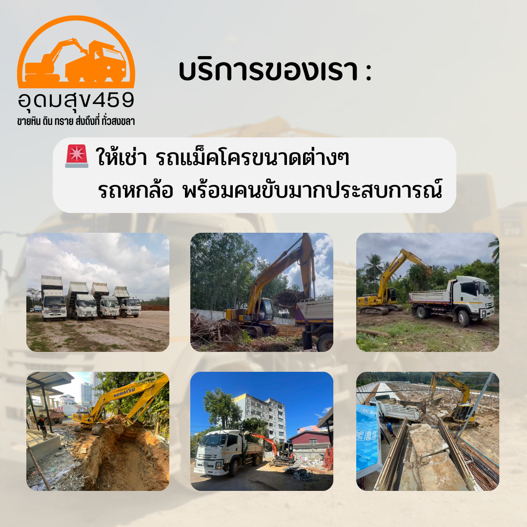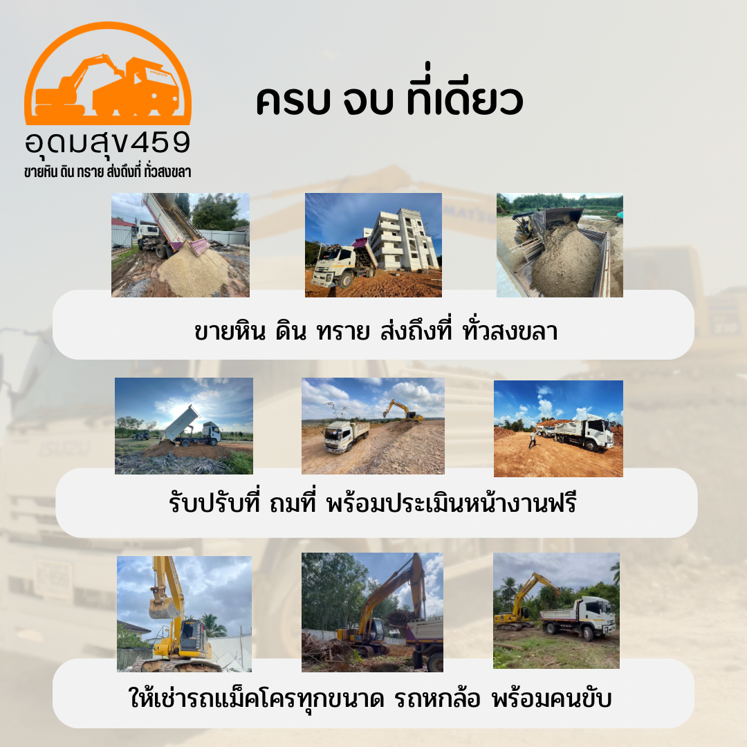 ร้านขาย หิน ดิน ทราย ทุกชนิดและให้บริการเกี่ยวกับงานก่อสร้าง ชั้นนำของเมืองหาดใหญ่ สงขลา ไม่ว่าจะเป็น บริการจัดส่งหิน ดิน ทราย ถึงที่หน้างานของคุณ, บริการปรับพื้นที่ ถมที่ เคลียริ่งพื้นที่ ประเมินหน้างานฟรี, บริการให้เช่ารถแมคโคร รถบรรทุก ทุกขนาด พร้อมคนขับมากประสบการณ์ ด้วยการบริหารจัดการอย่างมีประสิทธิภาพ มีอุปกรณ์ที่ครบครัน จดทะเบียนนิติบุคคลและมีใบอนุญาตประกอบกิจการถูกต้องตามกฎหมาย ทำให้งานของเรารวดเร็ว ฉับไว ถูกต้อง ตรงตามความต้องการของลูกค้า ยืนยันคุณภาพจากผู้รับเหมาหลายราย ทั้งงานหมู่บ้านจัดสรร งานราชการ
