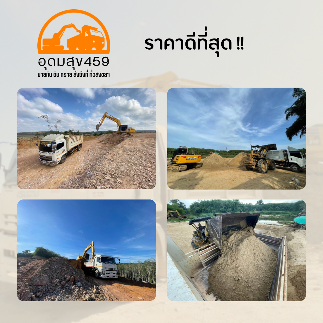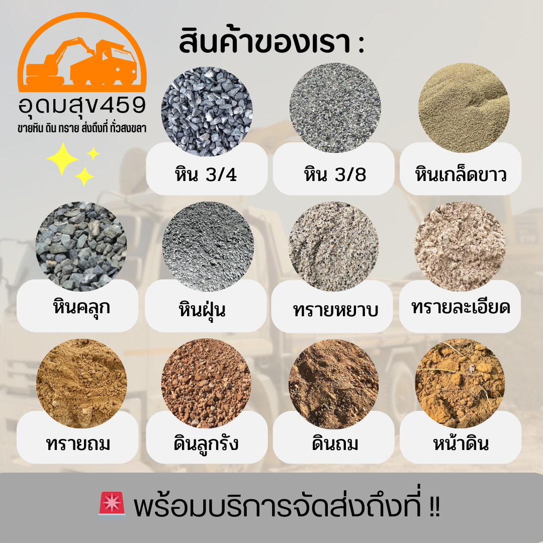ขาย ทรายหยาบ, ทรายละเอียด, ทรายถม, หิน 3/4, หิน 3/8, หินเกล็ดขาว, หินคลุก, หินฝุ่น, ดินถม, ดินลูกรัง, หน้าดินสำหรับเพาะปลูก พร้อมบริการส่งถึงที่ ทั่วสงขลา หาดใหญ่
